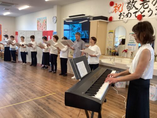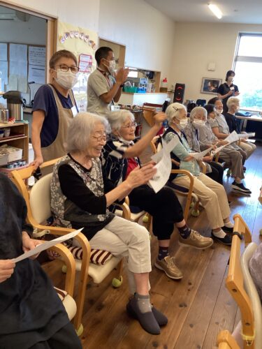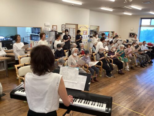 みなさん、ノリノリで一緒に歌い、先生が即興でデイサービス北谷で作った歌を弾いてくださったので、贅沢な生演奏で大合唱(^^)v