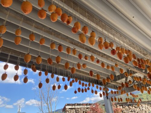 軒先に吊るされた無数の干し柿が、からりとした冬の青空の下、鮮やかなオレンジ色に映えていて、その色彩の対比は、とても美しい!