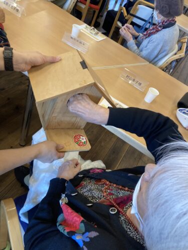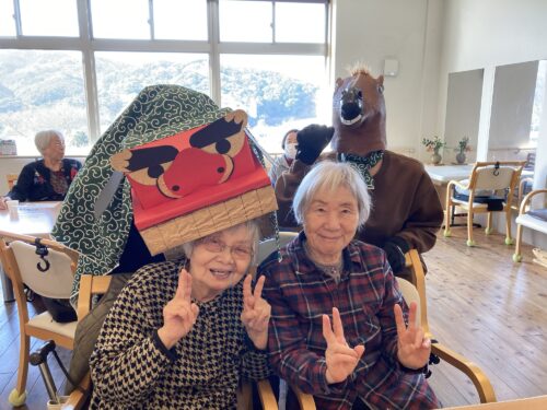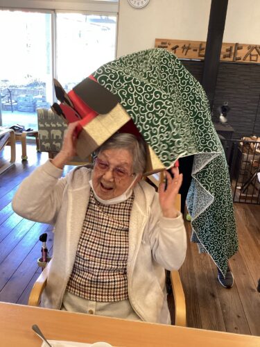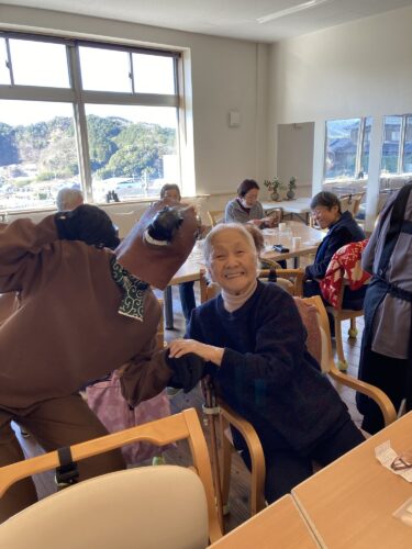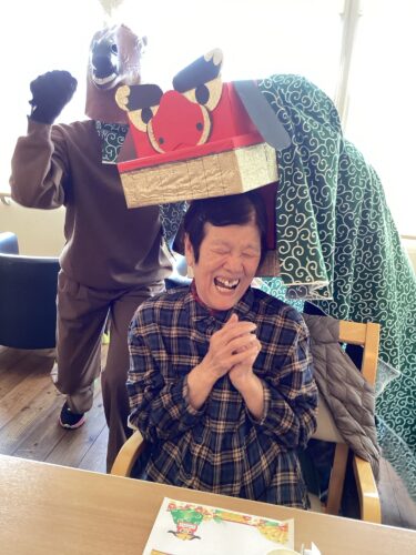 今日は獅子舞が訪れ、利用者様ひとりひとりに向かって、優しく噛みついて回りました。噛まれるたびにホール内に響く歓声や笑い声でスタッフも思わずにっこり!